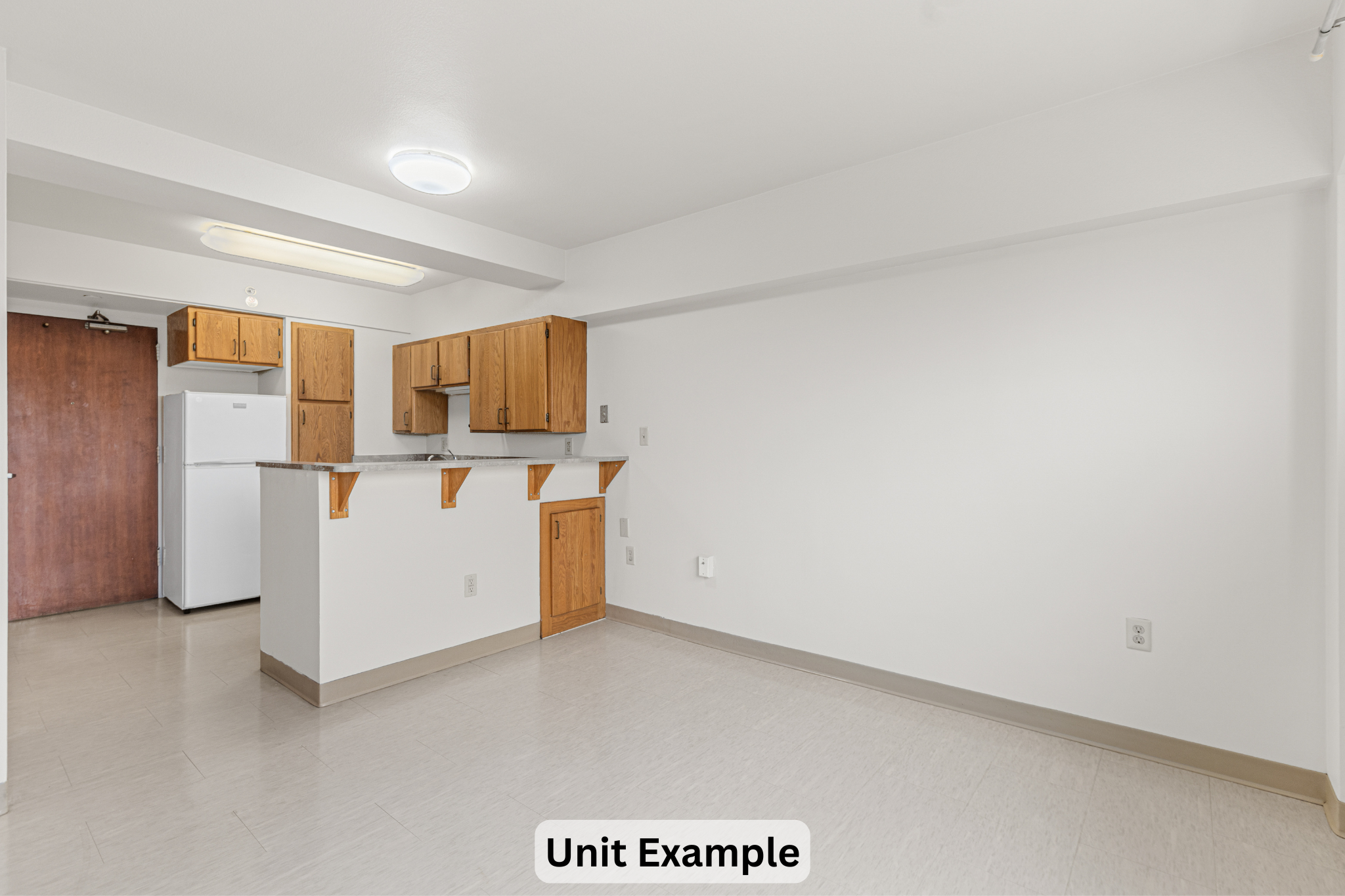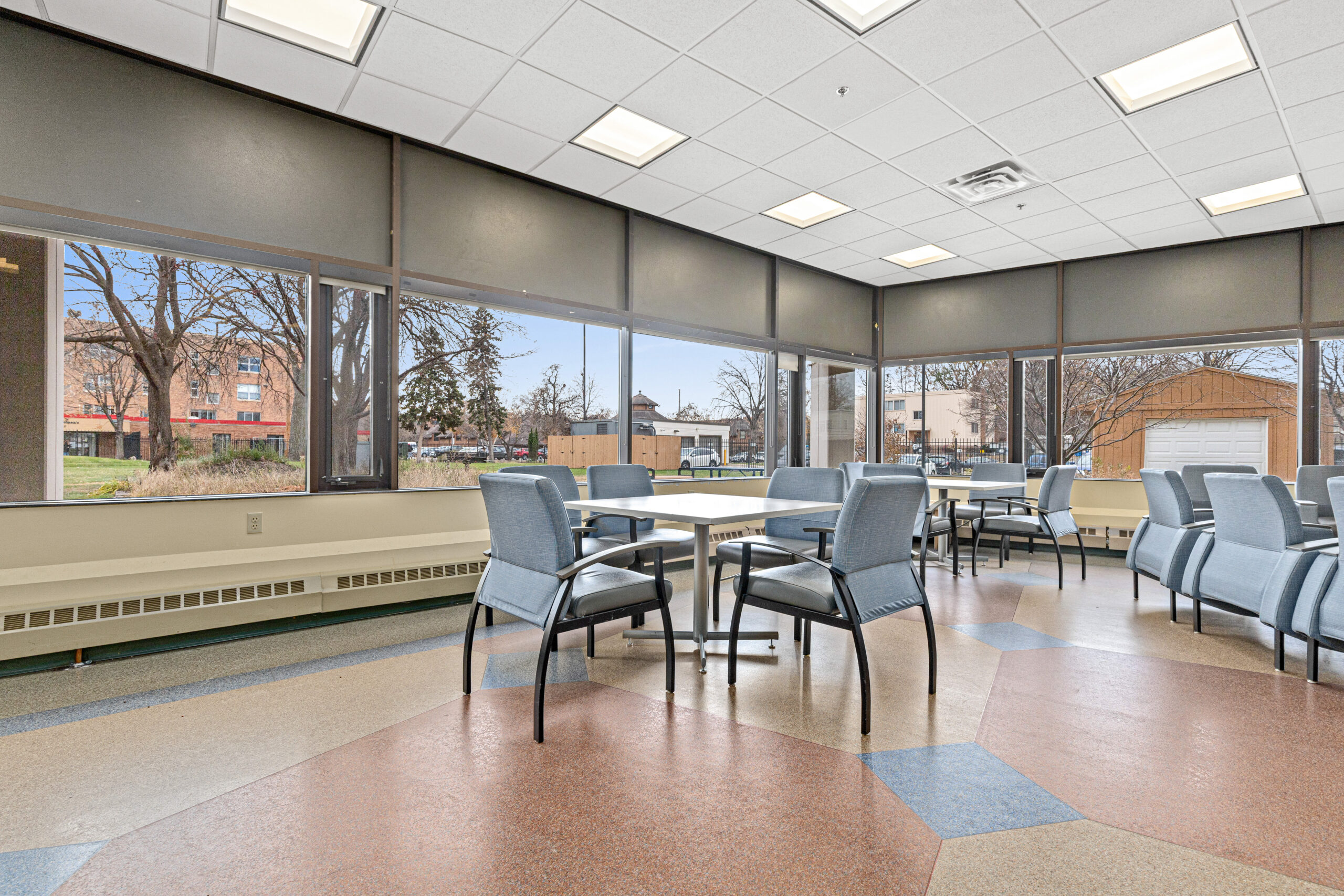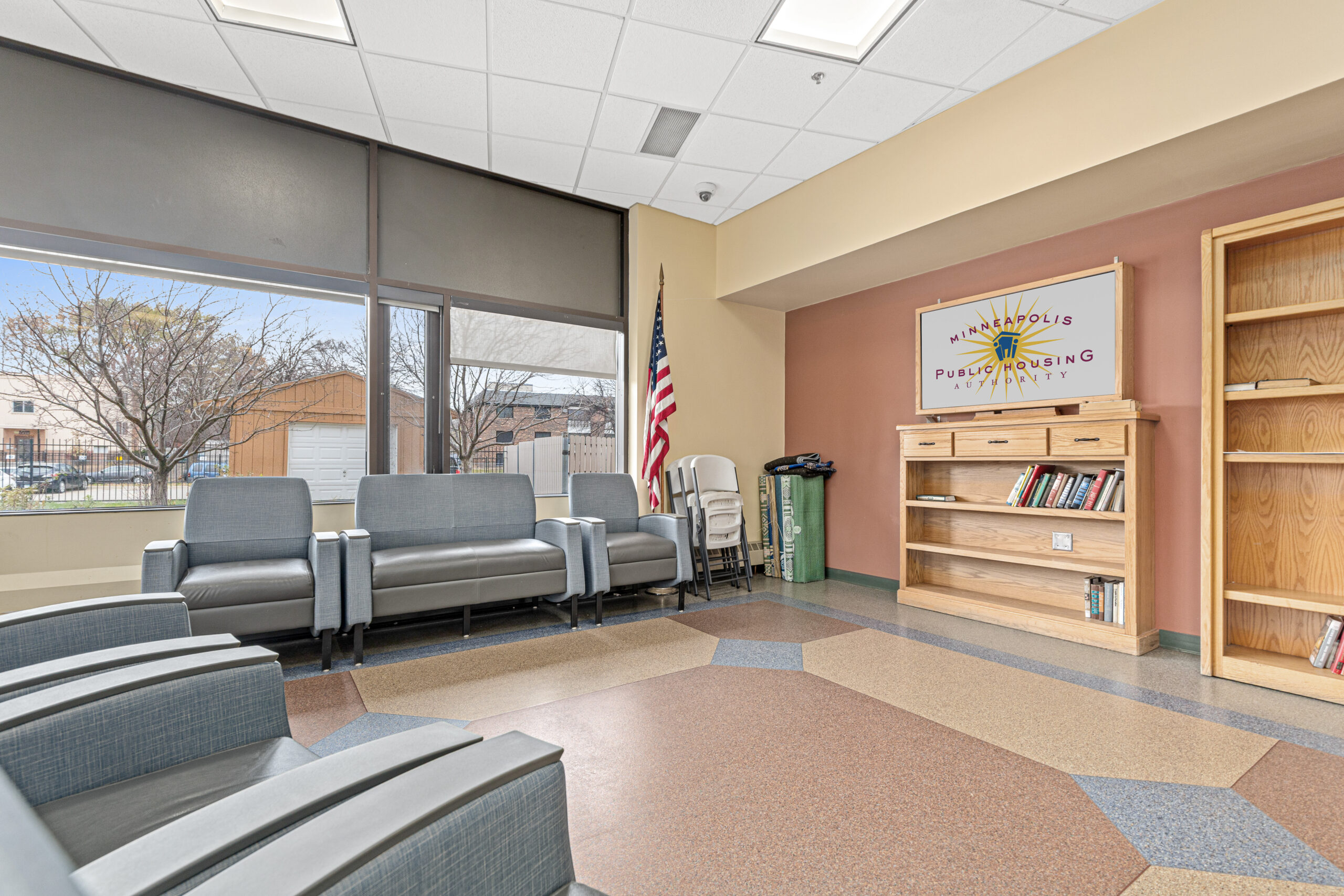 Property management offices and resident community space are conveniently located on the first floor of the building. The first-floor community room offers a TV, vending machine, and a kitchenette making it a great place to chat with neighbors or watch a movie. Residents use this space for meetings with support staff and community activities. Laundry machines and an exercise area are located on the basement level.