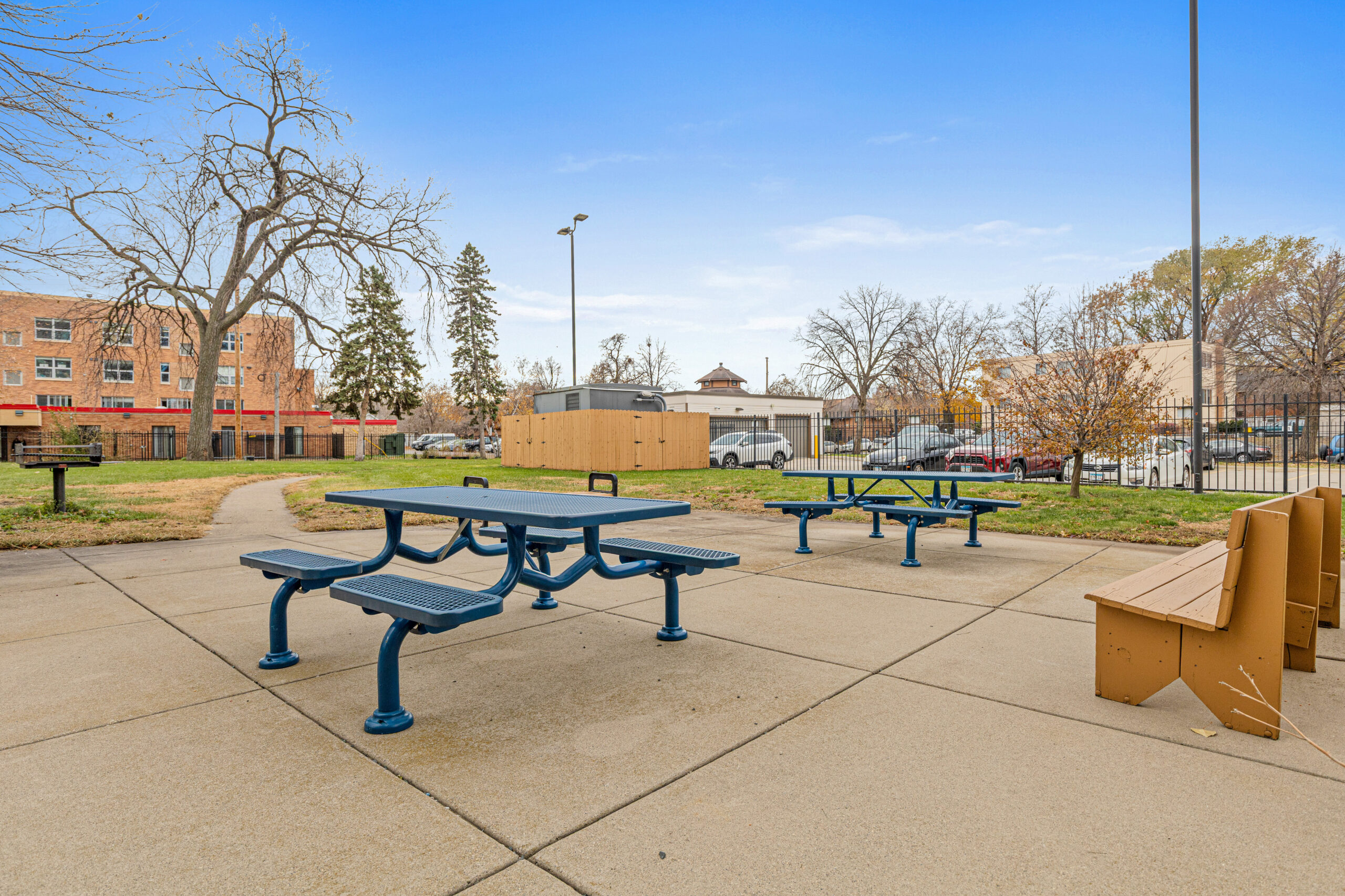 The Pentagon also boasts a gated outdoor space featuring picnic tables. This space allows residents to enjoy the fresh air and relax outside.