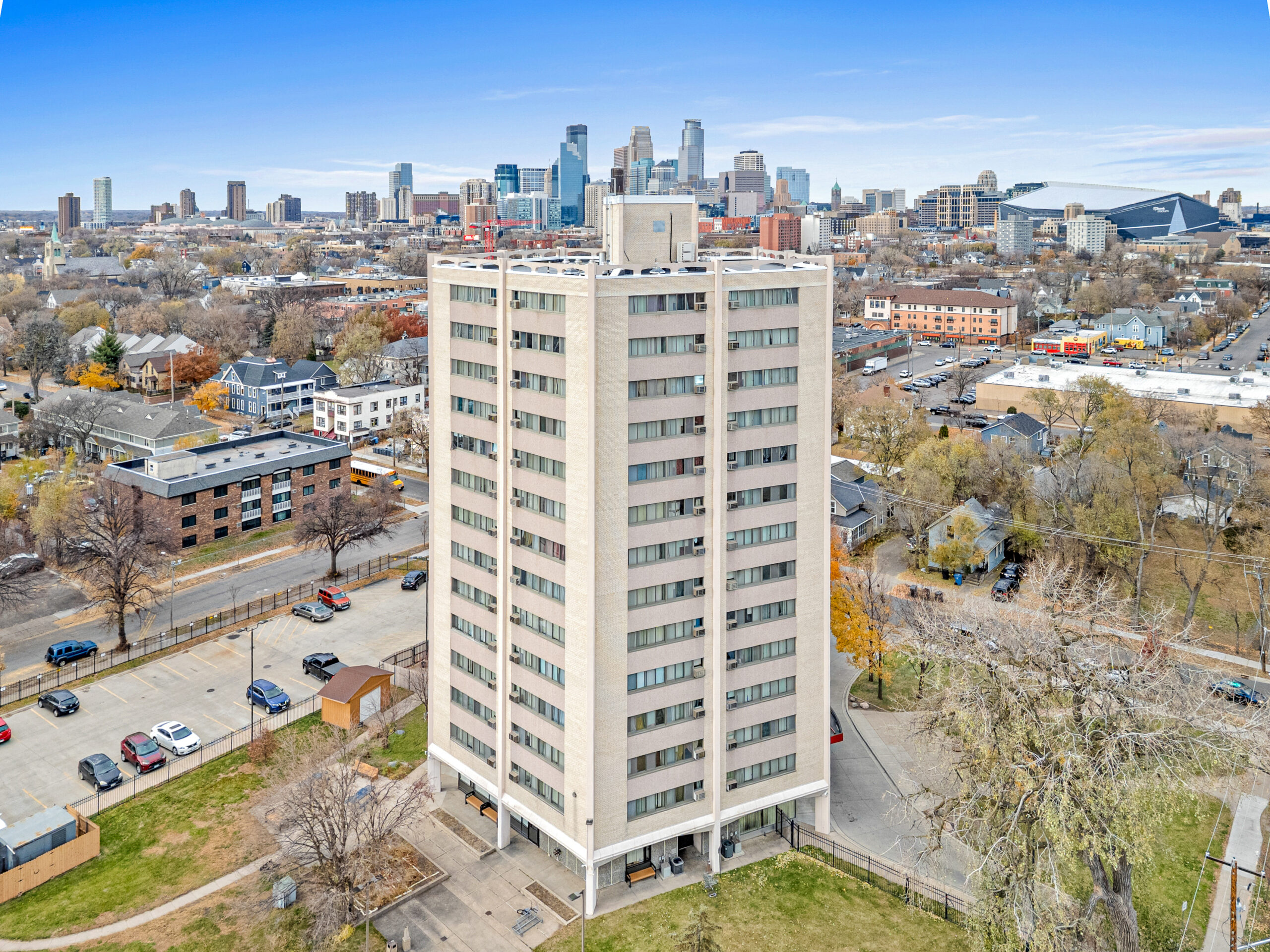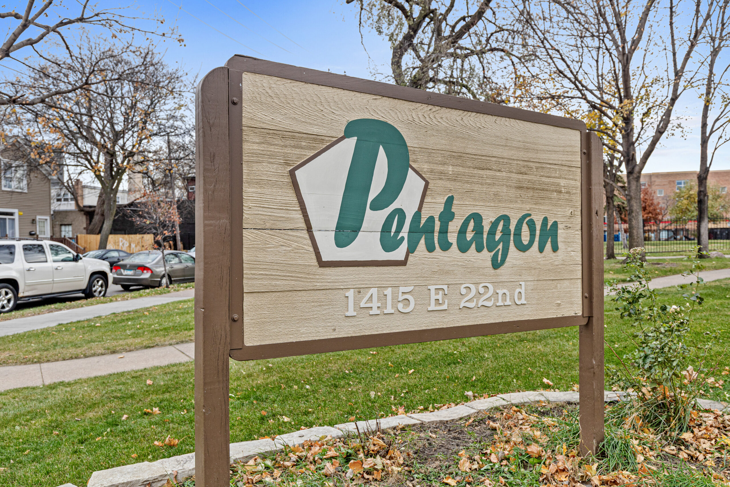 Built in 1963, The Pentagon is made up of 129 one-bedroom units. This 14-story high-rise building is in the Ventura Village neighborhood near East Phillips Park.