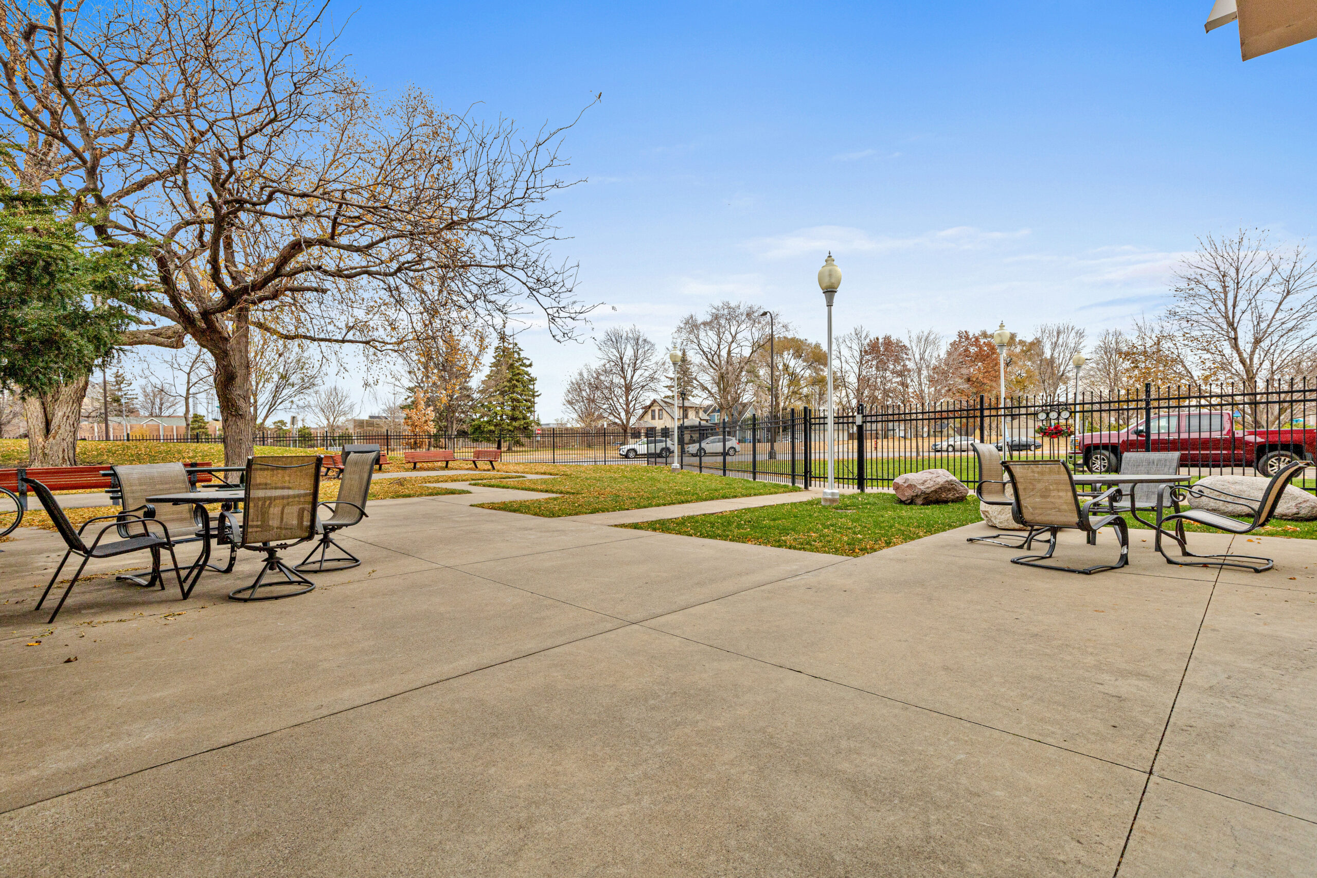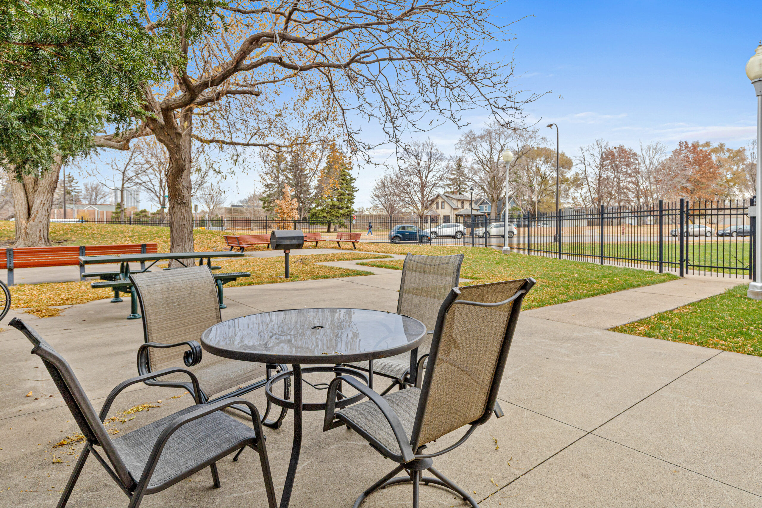 The Riverside also has outdoor space featuring a fenced patio, garden, and grill. This space allows residents to enjoy the fresh air and relax outside.